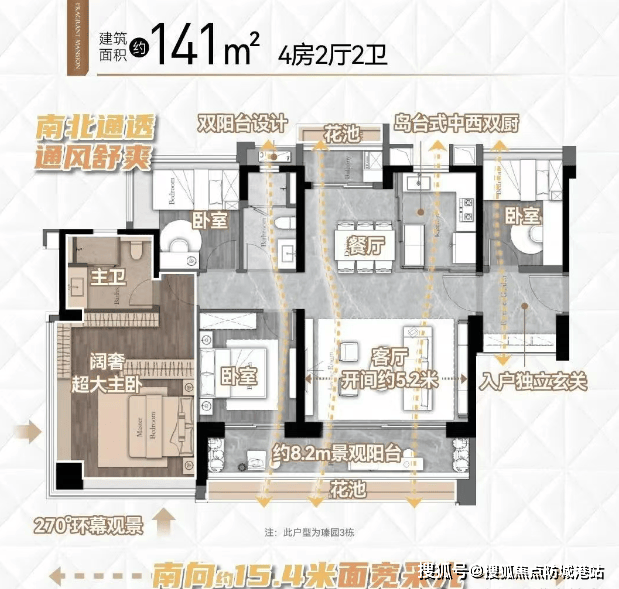 建面约141平方米:新规4房户型,多开间朝南,采光视野约14.6米,景观大阳台约8.2米,主卧端厅设计,270°全景采光。