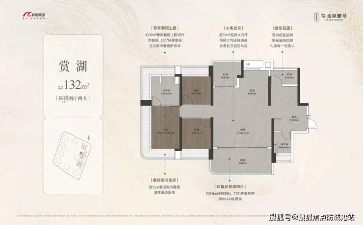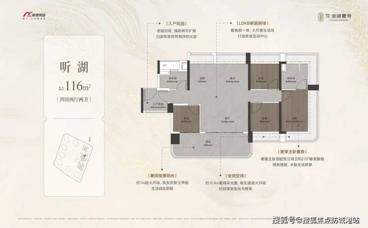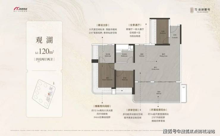 115㎡四房两厅两卫:双阳台设计(生活阳台+景观阳台),主卧套间面积达22㎡,总价约414万元;