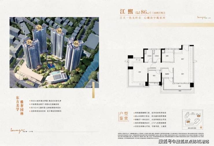 建面约86㎡三房两厅两卫:南向观景大阳台,全屋动静分离,主卧带270°飘窗。