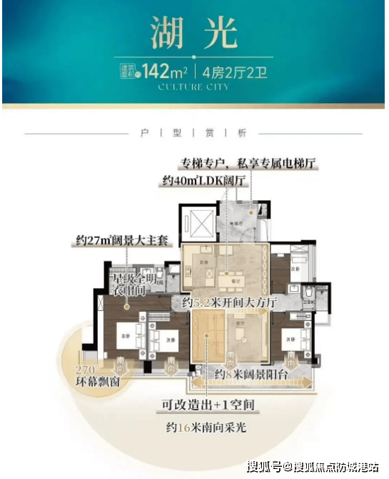 建面约142㎡四房:配备约8米全景阳台,站在阳台即可俯瞰约1.2万㎡湖景,高层还能远眺江景,16米南向采光让室内光照充足,兼具景观与舒适度。