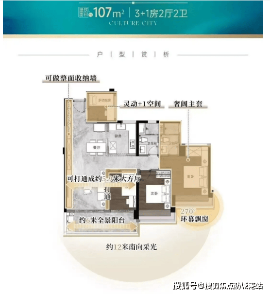 建面约107㎡四房:拥有12米南向采光面,通透LDK一体化设计,搭配约6米奢阔阳台与独立入户花园,小户型也能拥有大尺度体验,满足刚需改善家庭需求。