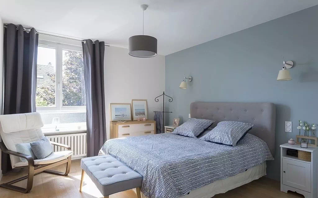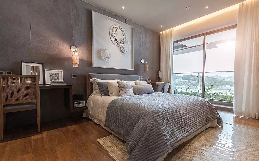 7、卧室窗帘一定要选遮光的,不然容易影响睡眠。想要达到小黑屋的境界,可以做一个窗帘盒,遮住从窗帘杆上面透过来的光。