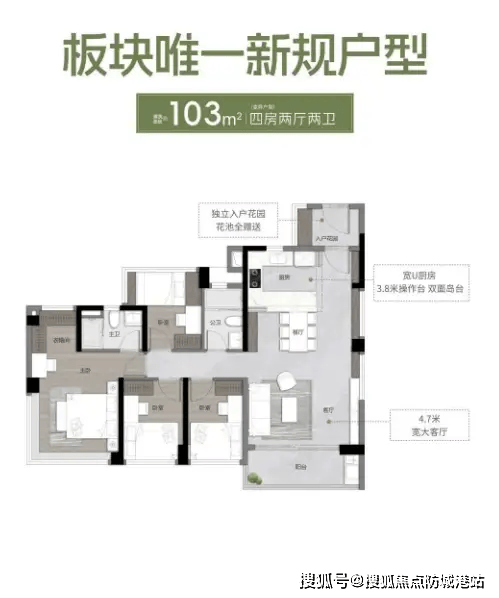 105㎡户型四房两厅两卫:南北对流,5 米大宽厅,主卧带 L 型超 7 米转角飘窗,实用率 135%,适配改善家庭。