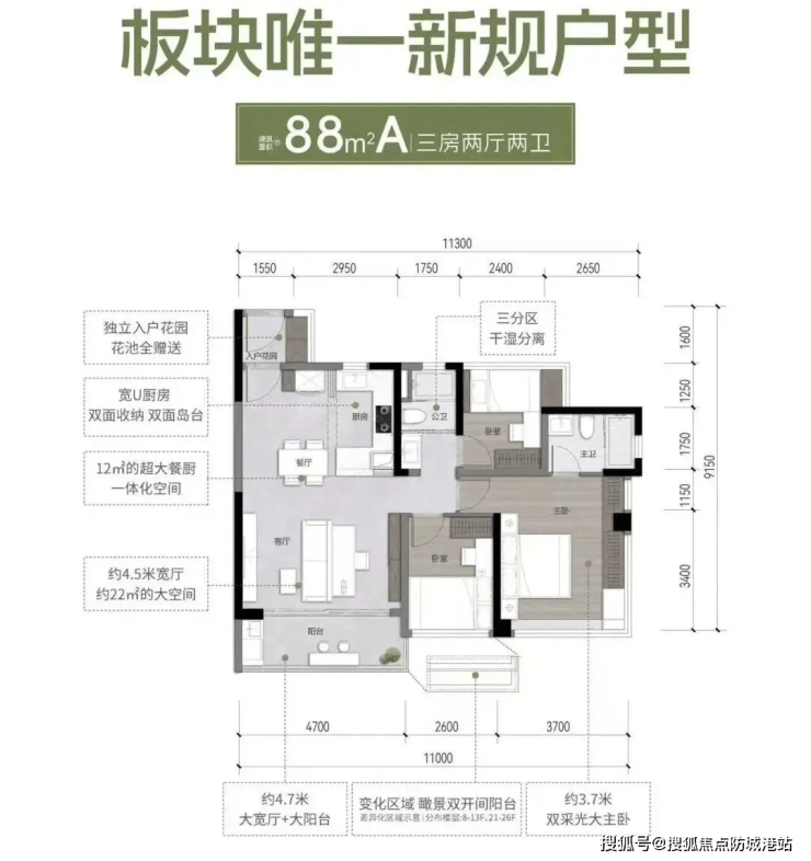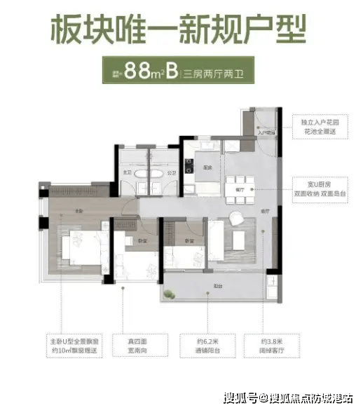 88㎡B 户型南向三房两厅两卫:主卧 270° 飘窗可打造梳妆台衣帽间,7.3 米通铺阳台连接次卧,LDKG 一体化互动空间,实用率 132%,是板块爆款户型。