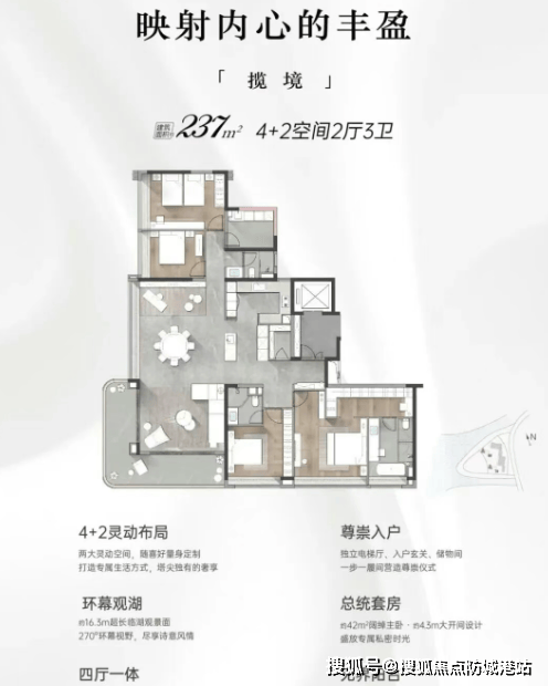 所有户型均朝湖布局,237㎡户型配备270°环幕景观阳台,俯瞰湖光水色;