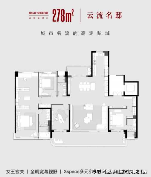 278㎡户型:四房双主卧配置,LDKG一体化公区,超大观景阳台直面江面;