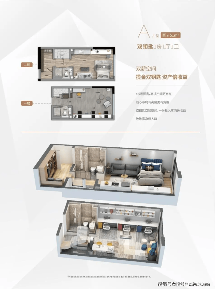 加粗 2、A 户型:约 51㎡ 双钥匙设计一房一厅 —— 投资客的宝藏户型