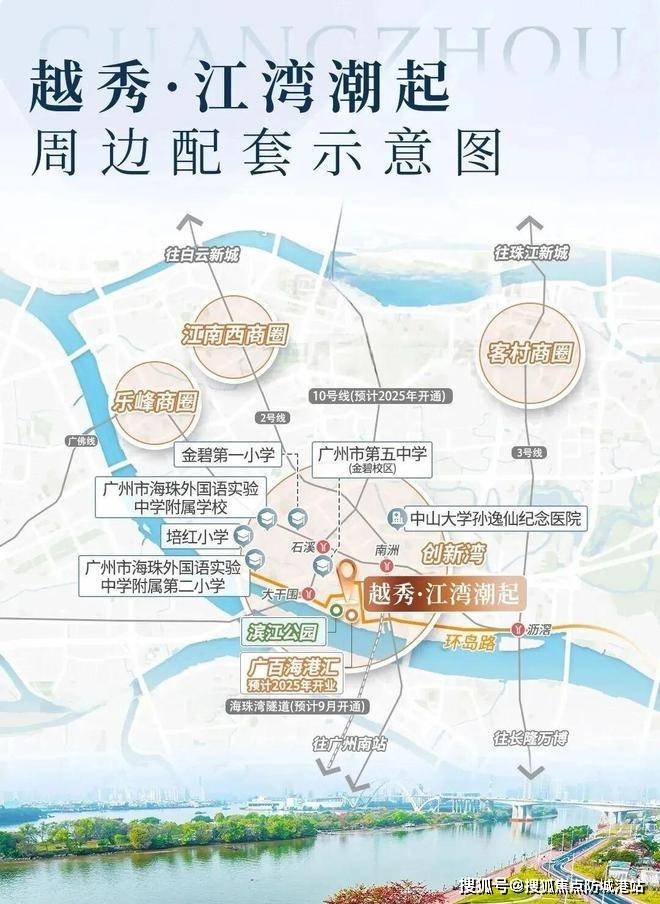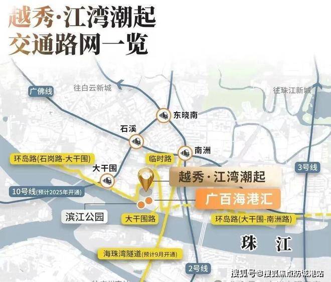 交通体系是衡量一个住宅项目长期价值的重要维度。越秀江湾潮起距离在建地铁10号线大干围站约650米。10号线属于广州轨道交通网络中的重要连接线路,未来将串联天河核心商务区、五羊邨商务圈以及体育西综合交通枢纽。轨道交通带来的不仅是通勤效率提升,更重要的是区域经济活力的持续导入。地铁网络本身具有明显的溢价效应,尤其对于改善型及高端改善型住宅产品而言,轨道距离控制在800米以内通常被视为优质步行通勤区。项目周边还依托环岛路交通规划体系,环岛路作为海珠区重点交通工程,承担着城市内循环交通功能。随着未来道路逐步贯通,海珠西部多个生活板块之间的连接将更加顺畅。
