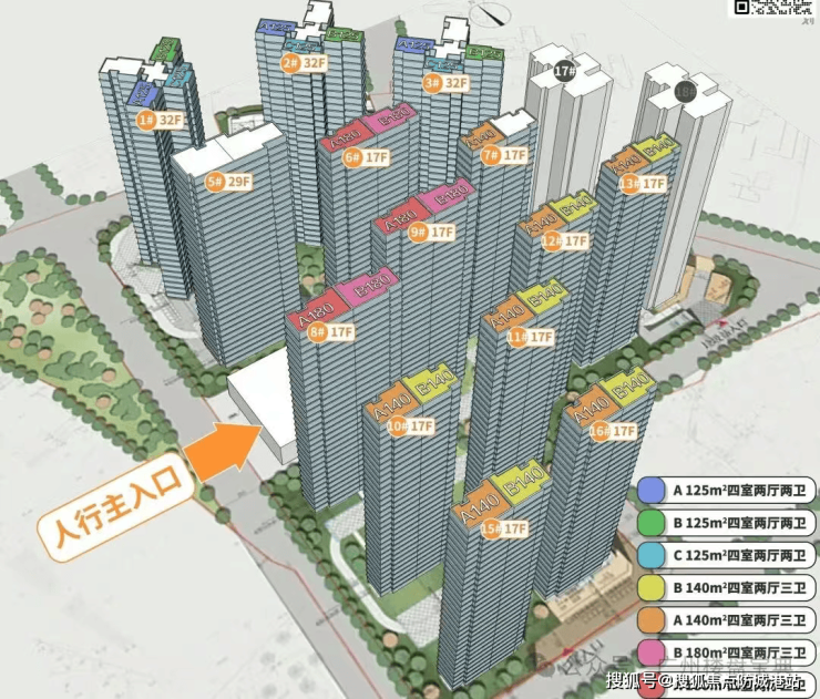 建面 125-129㎡四房两厅两卫:紧凑实用型改善户型,2 梯 4 户塔楼布局,总层高 32 层。主卧带独立卫浴 + 衣帽间,南向阳台连通客餐厅,空间零浪费;全屋标配中央空调、新风系统,厨房预留双开门冰箱位,满足日常居住所需。当前该户型剩余房源 28 套,均价 79000 元 /㎡,限时钜惠 97 折后总价约 950-980 万元。