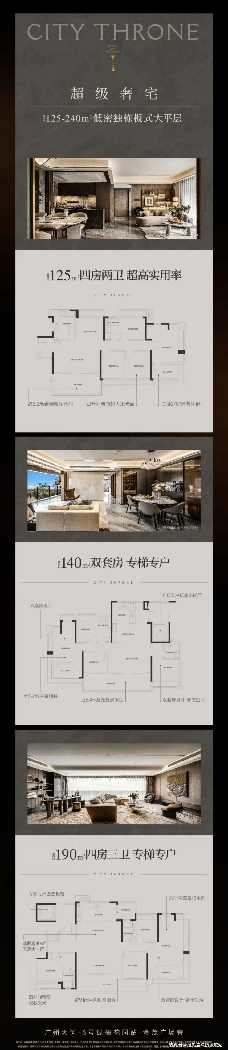 建面 240㎡五房两厅三卫:全盘楼王户型,仅 28 套稀缺房源,位于 T5 栋独栋板楼,专梯专户配置约 9㎡奢阔入户电梯厅,户户三面观景,直览白云山与城市中轴。层高 3.3 米,配备 9 米南向露台级阳台,36㎡主卧起居室带 270° 环幕飘窗,双台盆主卫 + 独立衣帽间,满足高端改善家庭的极致居住需求。该户型实景样板间已开放,当前剩余房源 6 套,均价 105000 元 /㎡,限时钜惠 97 折后总价约 2450-2500 万元。