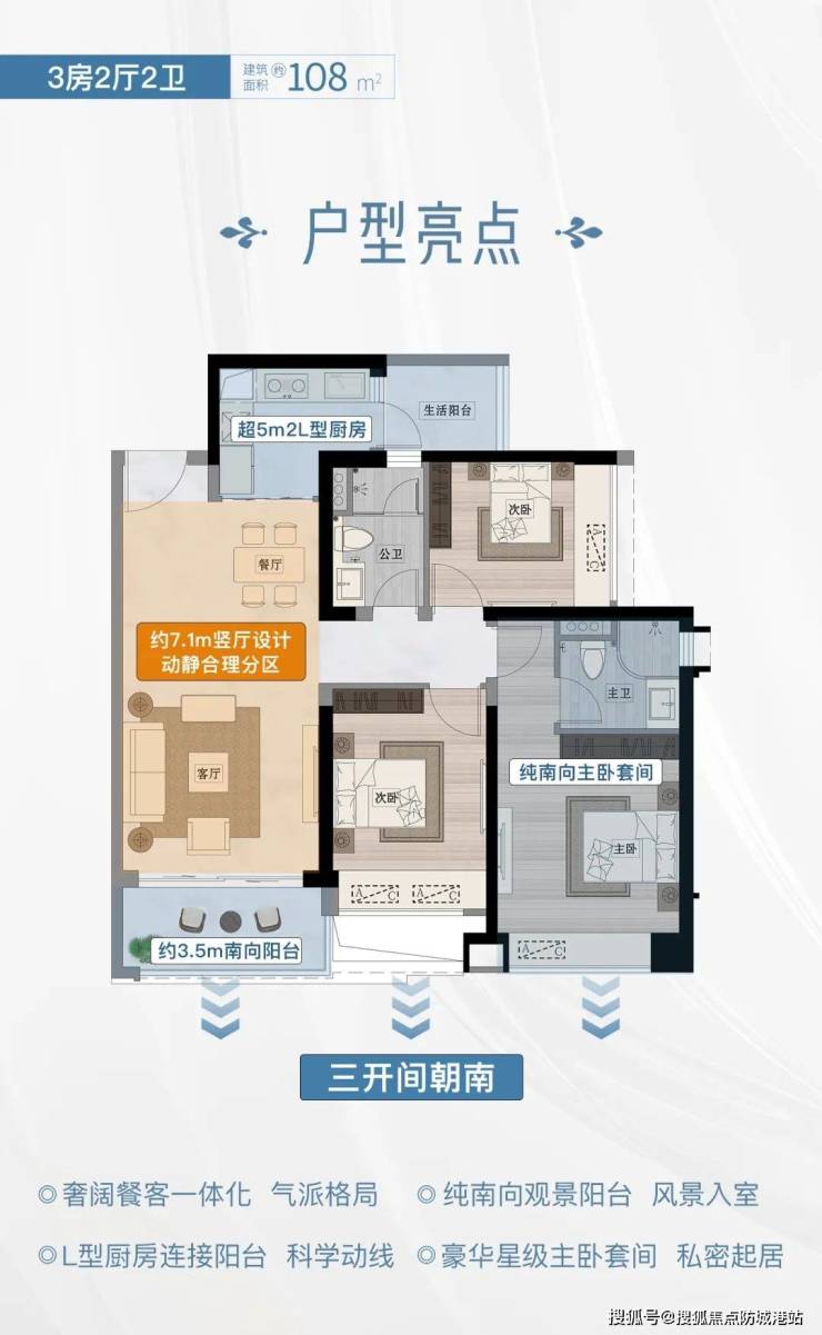 建面约108㎡三房两卫,奢阔餐客双厅 ,纯南向双阳台。L 型厨房 · 豪华主卧套间。