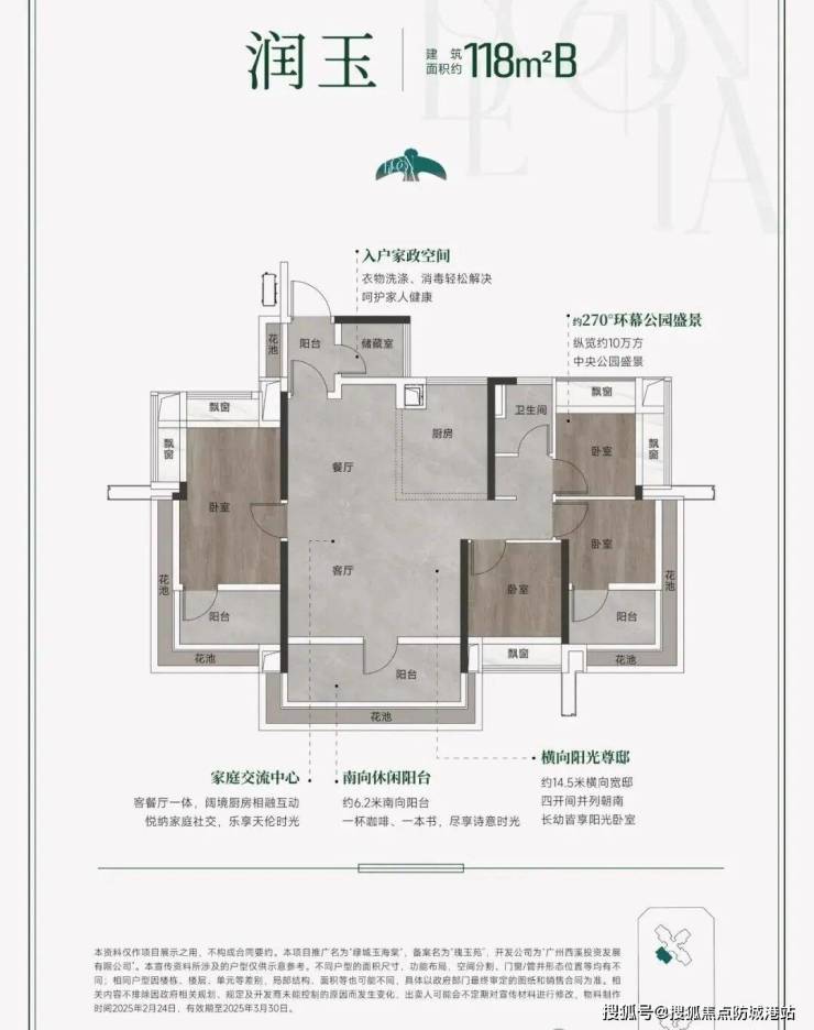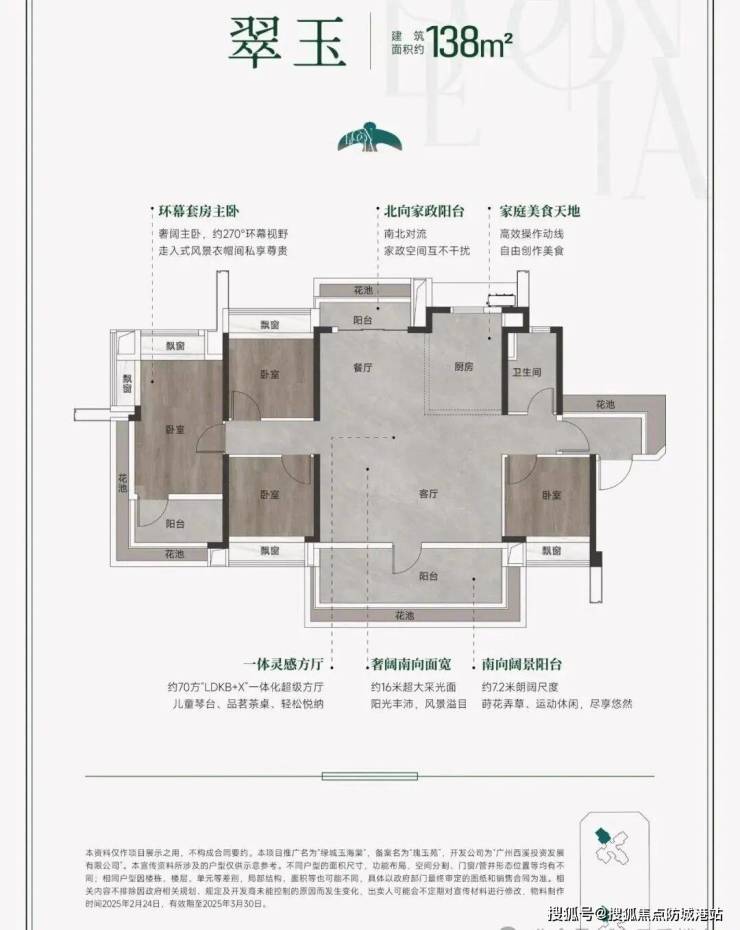 户型设计:绿城玉海棠以“户户南向、单边位布局”为原则,确保每户均享充足采光与通风。105㎡户型采用南北对流设计,搭配全屋飘窗与花池赠送,实际使用面积达120㎡;138㎡户型则以约70㎡的LDKB大方厅成为亮点,空间尺度堪比刚需小户型,满足家庭社交与娱乐需求。