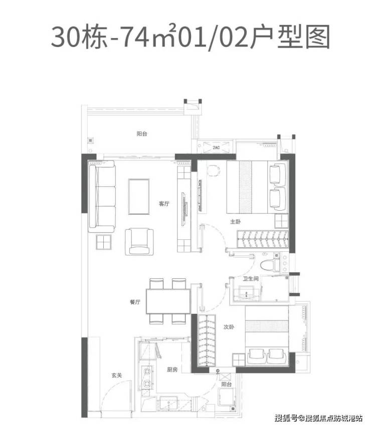 建面约74㎡滨水精致两房:南北通透,布局紧凑,适合小家庭。