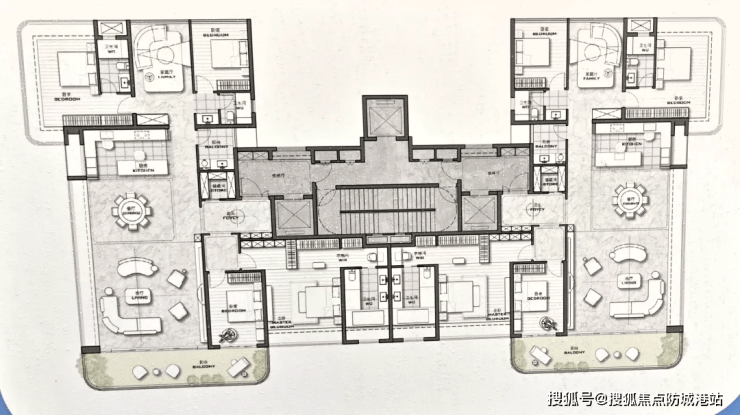 项目采用环抱式布局,16栋住宅分为四个组团,既保障了中央园林的完整性,又确保每栋楼都能享有良好的采光与视野。其中,7栋为纯大平层产品,头排三栋为28层非超高层,二排则为37层超高层,全部面向蕉门水道,正南或东南朝向,无任何视线遮挡。得益于地块享有整体建筑高度20%弹性的特殊政策,项目在限高框架下仍能最大化临江面,让更多楼层享受到一线江景资源。塔楼最高达120米,与板楼错落布局,形成丰富的天际轮廓,同时避免相互遮挡,真正实现“江景平权”。