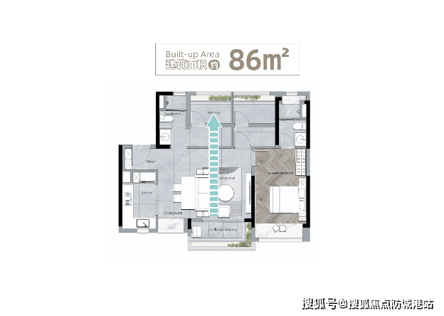 86㎡ 三房两厅两卫:横厅设计,带主套间,主阳台、主套间均朝南,舒适度极高。