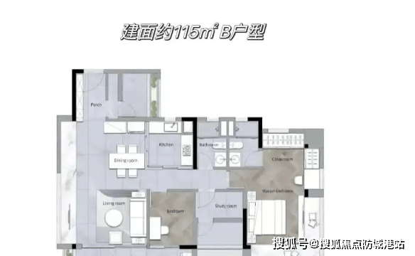 115㎡ 四房两厅两卫:约13米面宽,端厅设计,客厅超长飘窗可作为独立电视墙,空间感极强。