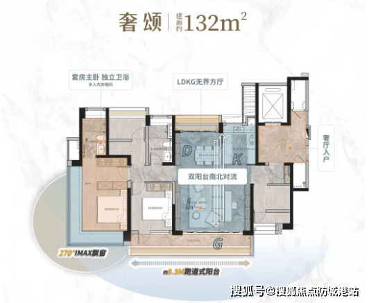 布局上,采用奢宅门厅设计,奢厅入户,无触直达宅门,归家仪式感十足,彰显尊贵身份;采用LDKG大方厅设计,将客厅、餐厅、厨房、阳台连为一体,空间开阔,遇见生活更多可能,既能满足日常休闲、用餐需求,又能举办小型家庭聚会,提升社交体验;打造洄游厨房空间,中西两厨交融,操作空间充足,收纳功能强大,满足不同烹饪需求,同时靠近餐厅,动线合理;打造约8.3M跑道式景观阳台,揽境无限,连接客厅与卧室,既能作为休闲观景区域,又能兼顾晾晒、储物功能,提升空间利用率;主卧配备270°巨幕观景窗,IMAX级景观环绕,同时配备独立卫生间、衣帽间与休闲区域,奢阔舒适,保障主人居住私密性与便捷度;其余三个卧室空间奢阔,采光充足,可灵活作为儿童房、书房、客房、老人房等,满足家庭多样化需求;同时打造景观家政阳台双分离,空间各司其职,提升居住的便捷度与整洁度。