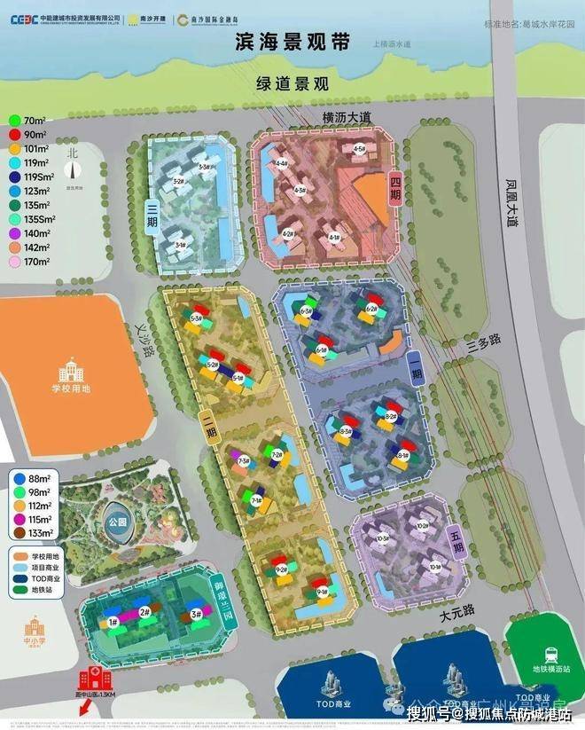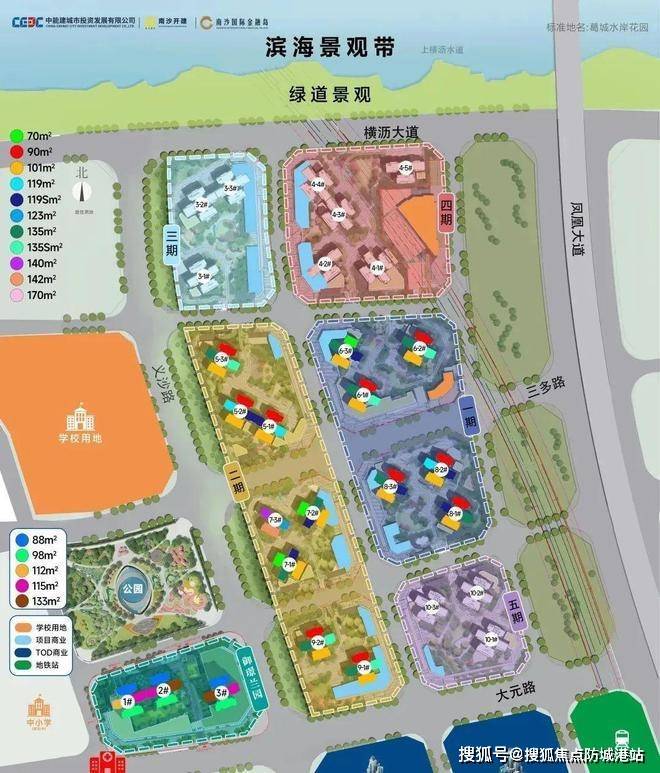 开发方是中国能建城发,央企背景,联合南沙本地平台公司一起操盘,整体实力比较稳。项目占地约15.25万平方米,总建筑面积62万平方米,规划了10个地块、25栋住宅,总户数大约5000户,是横沥岛目前规模最大的社区。住宅70年产权,容积率3.8-4.0,绿化率38%,居住密度相对适中。物业交给葛洲坝物业,收费3.3元/㎡·月,属于中等偏上水平。社区自带约4000㎡临街底商加上2000㎡生鲜超市,基本生活需求能覆盖。