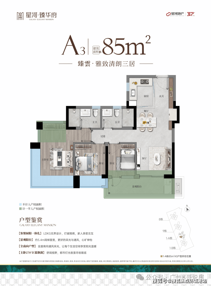 项目主推的建面约85㎡三房,是新规产品的核心刚需户型,得房率约100%,空间利用率高,可满足三口之家的居住需求。该户型共有三个细分户型,分别为A2、A3、A4户型,各有特色,适配不同业主的居住偏好。其中A2、A3户型采用全南向设计,做到客厅+三个卧室朝南,采光充足,通风效果好,日常室内光线明亮,无需频繁开灯,既节能又舒适。户型采用LDKG创变宽厅设计,将客厅、餐厅、厨房、阳台连通,形成开阔的公共空间,增加家庭活动区域,同时也提升了空间的通透感。主卧配备270°无边观景飘窗,可俯瞰社区景观与山体景色,增加了室内使用空间,也为业主提供了休闲观景的区域。