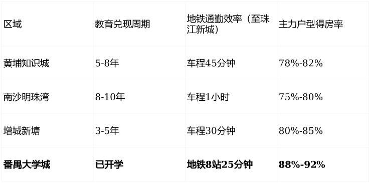 我们选取了广州3个热门新区(黄埔知识城、南沙明珠湾、增城新塘),从教育兑现周期、地铁通勤效率、产品力创新三个维度对比: