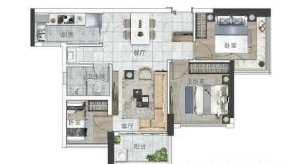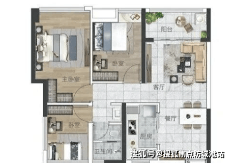 79㎡ 三房两厅一卫:阳光大主卧,一线临河视野开阔,L型厨房。