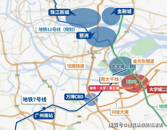 越秀·大学·星汇城地处广州国际创新城的核心地带,北接琶洲西区,东临金融城,距离珠江新城仅约15公里,地理位置得天独厚。交通方面,项目周边有地铁4号线新造站,直线距离约700米,3站可达万博CBD,4站抵达琶洲,5站到金融城,形成了便捷的轨道交通网络。此外,自驾出行也十分便利,东西向依靠南大干线(预计2023年全线开通),南北向通过金光东隧道(预计2022年底开通),快速连接各大核心商圈,大大提升了出行效率。