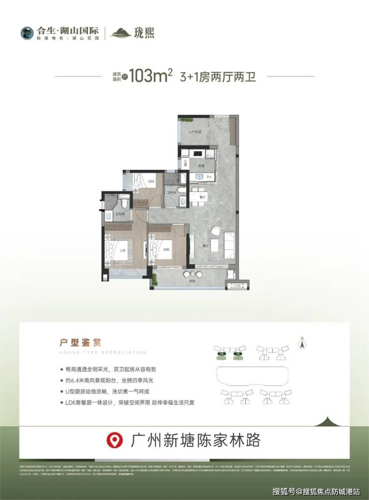 1. 建面约103㎡3+1房户型:该户型是湖山国际七期爆款102方产品的升级版,在空间布局上进行了优化。户型方正,南北通透,采光和通风效果极佳;3+1房的设计灵活多变,可根据家庭需求将灵动空间改造成书房、儿童房或储物间,提升空间利用率;客厅连接观景阳台,能充分欣赏社区园林景观,拓展视野;主卧配备独立卫生间,保证业主的私密性和舒适度。