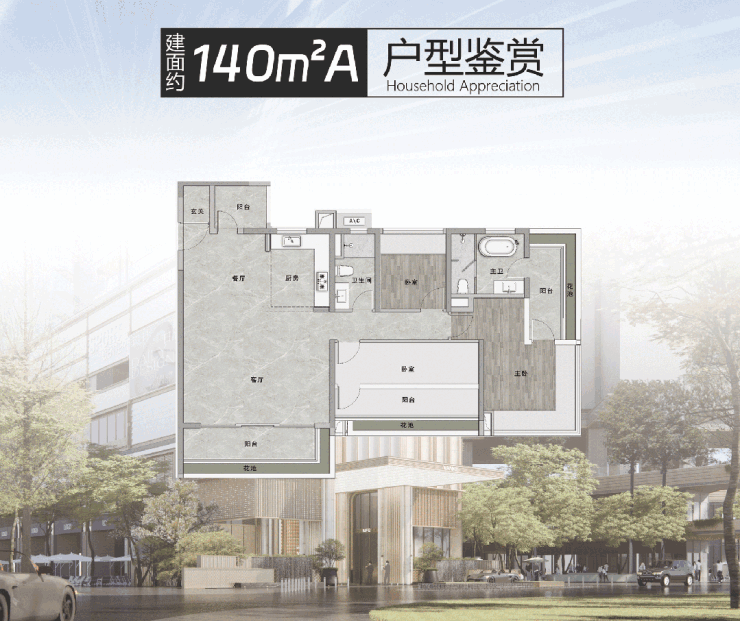 建面约125㎡四房两卫:双主套设计,6.5米景观阳台,总价约680万起;