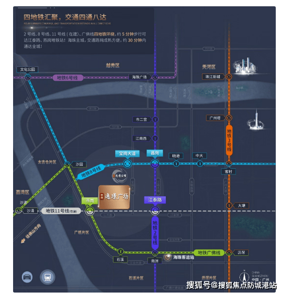 中冶逸景广场踞守大湾区核心腹地,雄踞广州市政府重点规划的“一区、一谷、一湾、一带”战略枢纽位置,无缝连接琶洲办公区与创新湾滨水商区。这里是承接创新产业精英人才品质居住需求的关键节点,地段价值无可比拟。在交通配套方面,项目真正实现了“四地铁环绕”的极致便捷。距离地铁2号线江泰路站、8号线宝岗大道站、广佛线燕岗站均在步行可达范围内,更有在建的广州首条地铁环线——11号线贯穿其中,串联天河、越秀、荔湾、白云、海珠五大中心城区,预计通车后将进一步放大项目的交通辐射能力。此外,项目周边构建了“三横五纵”的主城区交通路网,昌岗路、江燕路、环城高速与江南大道、宝岗大道等主干道交织成网,驱车30分钟即可通达全城。无论是日常通勤还是商务出行,业主都能享受到高效无阻的便捷体验,真正做到了“出门即地铁,转瞬达全城”。