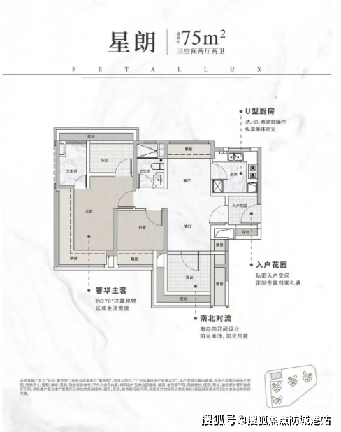 75㎡三房两卫:适合刚需家庭,进门带入户花园,南北通透,布局紧凑合理。