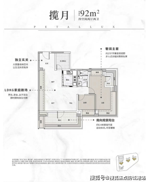 92㎡四房两卫:作为主力户型,设计了长阳台和入户玄关,尽管客厅旁的卧室面积较小,但总体布局实用性强。