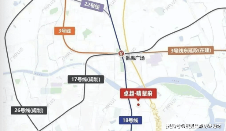 答:距离番禺广场站 3.2 公里,需公交 / 电动车接驳;17 号线尚在规划中,开通时间以政府公示为准,不做承诺。