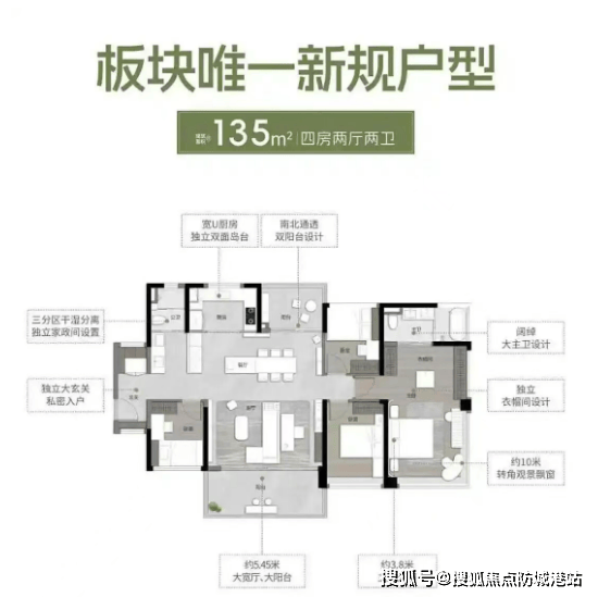 建面约135㎡四房两厅两卫(高端改善):该户型是项目的高端改善户型,适合多人口家庭或追求高品质居住体验的购房者,南北通透双阳台设计,通风采光效果极佳[2]。自带约5.25米大宽厅以及约5.45米大阳台,空间开阔大气,客厅可打造专属休闲区、观影区,阳台可欣赏滨水景观与社区绿化,居住体验佳[2];主卧开间约3.6米,空间宽敞,配备独立卫生间与衣帽间,私密性与舒适度拉满,堪比豪宅配置[2];四个房间均宽敞明亮,无浪费空间,可满足家人居住、办公、学习等多种需求;同时配备全屋隐藏式中央空调、高端岩板装修等,细节满满,提升居住质感[2]。