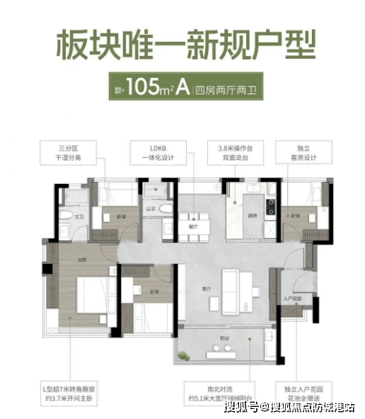 建面约105㎡四房两厅两卫(改善优选):该户型主打南北对流,通风效果极佳,适合注重居住舒适度的改善家庭,售价适中,性价比突出[2]。配备独立入户花园,打造专属玄关空间,便于收纳与换鞋;客厅有约5米大宽厅,空间开阔,可容纳多人聚会,搭配LDKB一体化设计,提升空间实用性与互动性[2];主卧带L型超7米转角飘窗,采光充足,可打造专属休闲区或梳妆台,提升居住舒适度;四个房间大小适中,布局合理,私密性强,适配多人口家庭居住[2]。