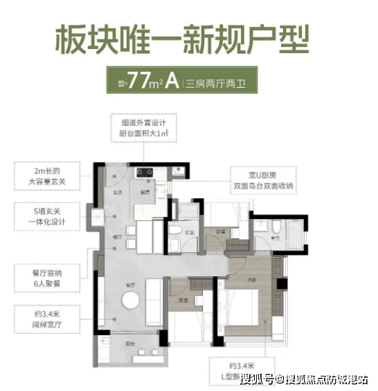 建面约77㎡三房两厅两卫(刚需福音):该户型是刚需家庭的首选,总价亲民,实际使用面积约100㎡,性价比直接拉满。户型方正、动静分离,三面宽南向,采光通风效果好,三个房间都能满足日常居住需求,再也不用面临“小户型不够住”的尴尬[2]。同时配备270°全景舱主卧,提升居住舒适度与私密性;客厅采用LDKB一体化设计,搭配可变空间,灵活适配不同居住需求;厨房配备方太三件套,卫生间配备智能马桶,超配交标,提升生活品质[2]。此外,该户型采用兼具木地板颜值+瓷砖性能的木纹砖,看起来更显高端,细节满满[2]。
