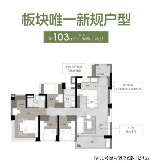 建面约103㎡四房两厅两卫(刚需改善过渡):该户型适合三口之家或即将迎来二胎的家庭,刚需改善两相宜。户型配备独立入户花园,提升居住私密性与仪式感;带约7米通铺阳台,270°全景采光大主卧,采光通风效果极佳,可直观欣赏社区滨水景观[2]。四个房间布局合理,空间利用率高,无浪费空间,其中一个房间可作为书房、儿童房或储物间,灵活适配家庭成长需求;LDKB一体化设计,提升空间通透性,便于家人互动;全屋隐藏式中央空调交付,提升居住舒适度与美观度[2]。