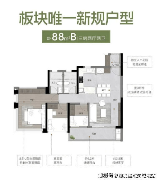 建面约88㎡三房两厅两卫(主力爆款户型):该户型是项目的主力户型,售价适中,适配大多数三口之家,分为A、B两个户型,可灵活选择。其中88㎡A户型,配备约4.7米大阳台,以及约3.5*4.3米双采光大主卧,阳台可兼顾晾晒与休闲功能,平时养花种草、喝茶观景都很惬意[2];88㎡B户型,南向布局,主卧270°飘窗附带创意方案,可打造梳妆台、衣帽间等功能区,提升居住舒适度;客厅开间3.9米,中西厨分离、阳台连接次卧,7.3米通铺阳台,空间开阔,实用性强[2]。