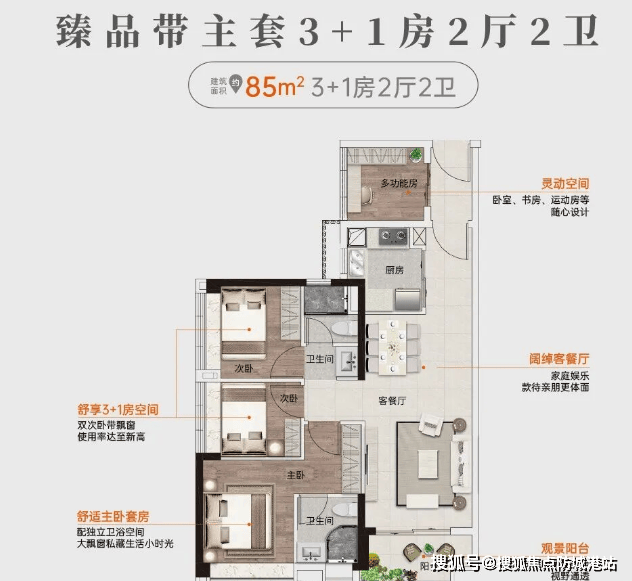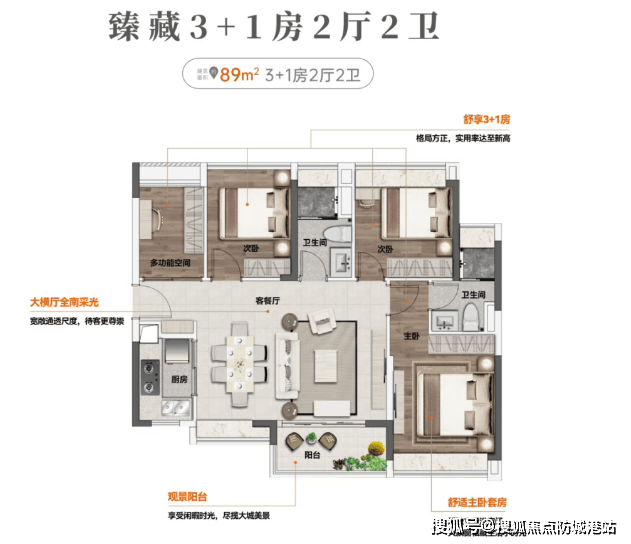 85㎡四房:东南向望园林泳池,双次卧带飘窗,使用率突破常规;
