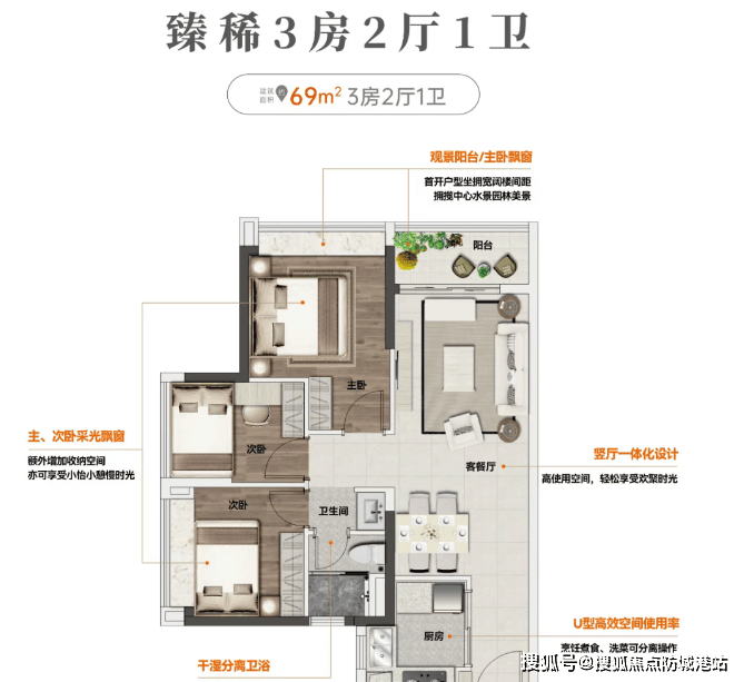 69㎡三房:阔绰阳台+双飘窗+U型厨房,小面积高功能;