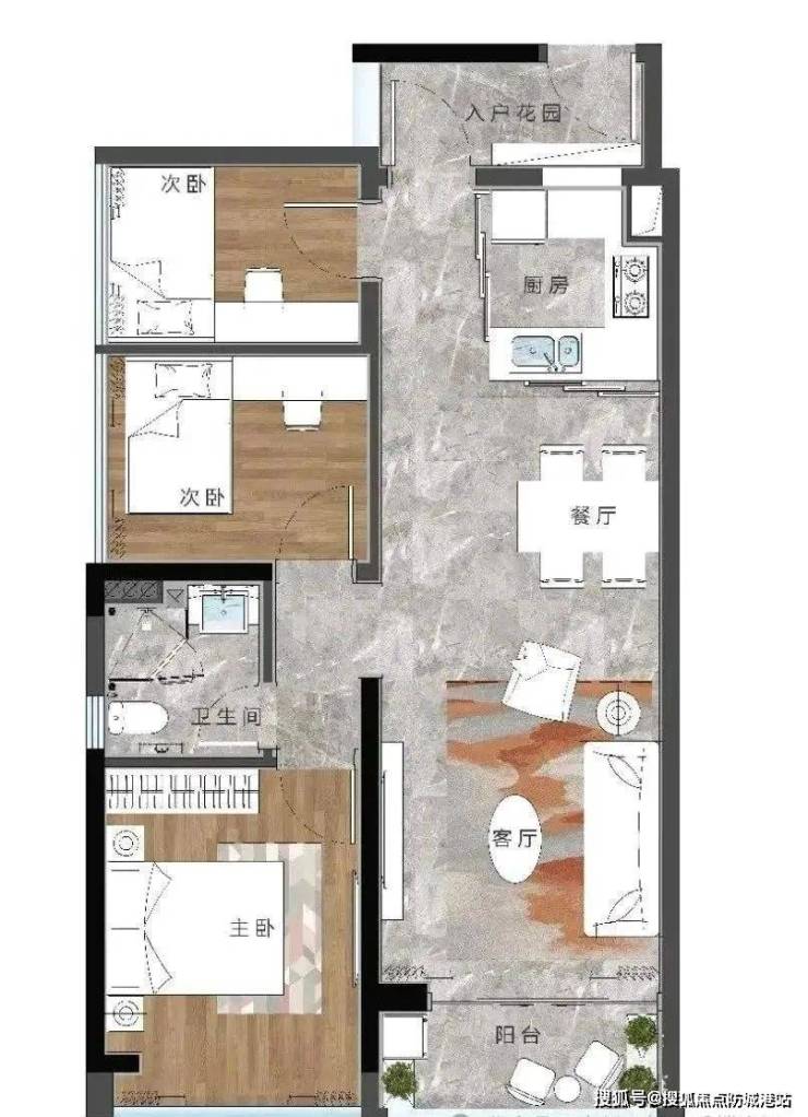 79平方米三房户型为竖厅设计,厅出阳台且阳台朝南,进深超过10米,确保了充足的采光。115平方米四房户型则采用了横厅设计,虽然过道较长浪费了一定面积,但主卧和次卧的门正对着客厅,私密性稍差。