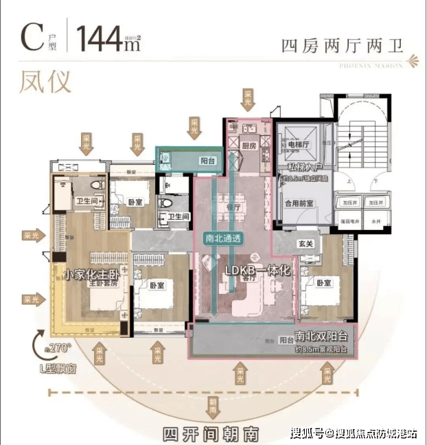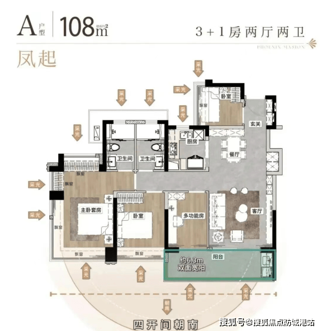 项目目前主推108㎡、128㎡、144㎡三种户型,均实现约100%使用率,突破传统公摊限制。108㎡户型为3+1房两厅两卫,南向四开间设计,搭配约6.3米双面宽阳台,采光通风俱佳;128㎡四房户型则拥有约7.5米南向景观阳台,空间尺度更为舒展;而144㎡顶配户型更配备私梯入户及约8.5㎡独立门庭,尊享归家仪式感,同时拥有南向8.5米景观阳台与北向生活阳台,实现功能与美学的双重平衡。所有户型均采用南向四开间布局,最大化引入自然光线,提升居住舒适度。