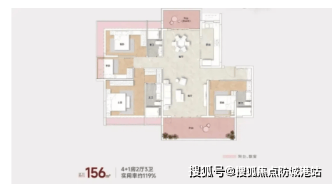 约156平户型作为楼王产品,仅规划9套房源,稀缺性拉满。该户型可扩展为4+1房2厅3卫格局,更难得的是在这个面积段实现了传统大平层才有的双套房设计,在老城区十分罕见。南北双阳台设计是该户型的一大亮点,南北通透,空气流通性极佳,同时北阳台可作为生活阳台,南阳台作为休闲阳台,功能分区明确。4+1房的格局可轻松满足三胎家庭需求,多余空间可改造为影音室、健身房或书房,兼顾家庭居住与娱乐需求,是高端改善家庭的理想之选。