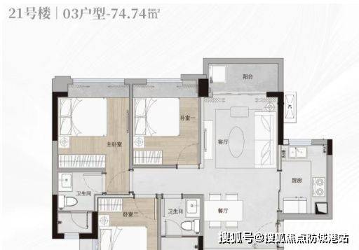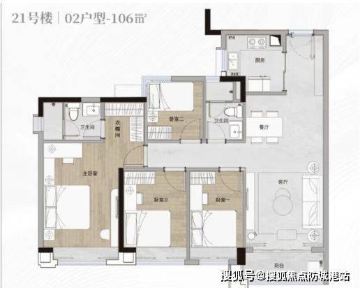 户型空间方面,项目住宅产品以三房与四房户型为主,采用独立玄关、客餐厅连接、功能分区明确的室内结构。部分户型采用双卫设计,以适应家庭成员使用需求。同时,户型设计注重区域分布完整性,使公共空间与私密空间分布合理。部分户型具备南向采光面或景观朝向,使自然光线与景观资源进入室内空间。