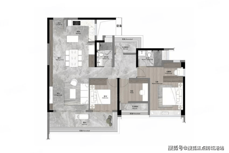 140㎡四房: 动静分区明确,全屋全明设计。入户玄关增加收纳,约8米双连宽景阳台气势恢宏。主卧采用“小家化”设计理念,可布置化妆间、游戏空间或阅读角,极大提升了居住的舒适度和趣味性。