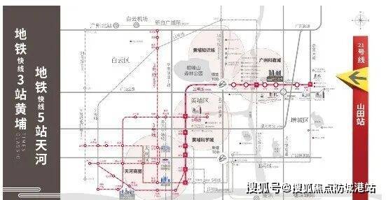 从山田站出发,快线5站到天河,接驳 14号线知识城支线及16、27号线(规划中),可无缝衔接白云、新塘等区域。