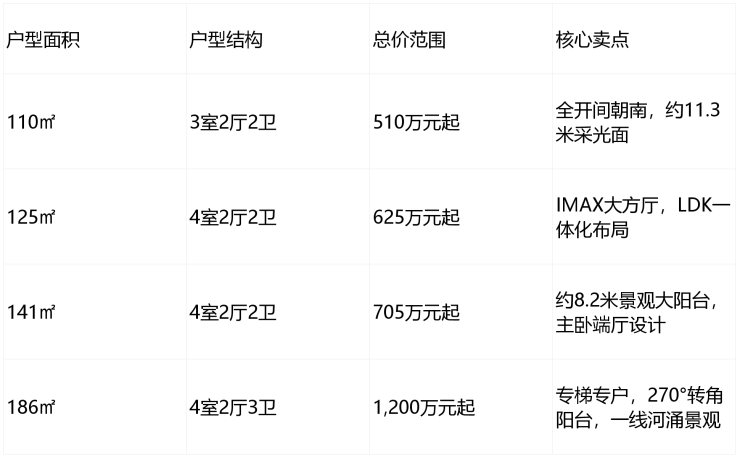 A:项目在售110-186㎡全南向3-4居,具体包括110㎡3室2厅2卫、125㎡4室2厅2卫、141㎡4室2厅2卫、186㎡4室2厅3卫。