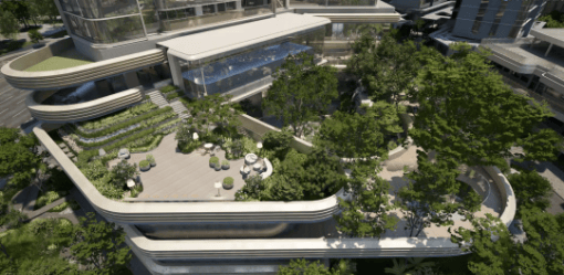 架空层内嵌入“船舷花园”,融合林泉、瀑布、溪流与花木,营造漂浮于CBD之上的都市秘境;