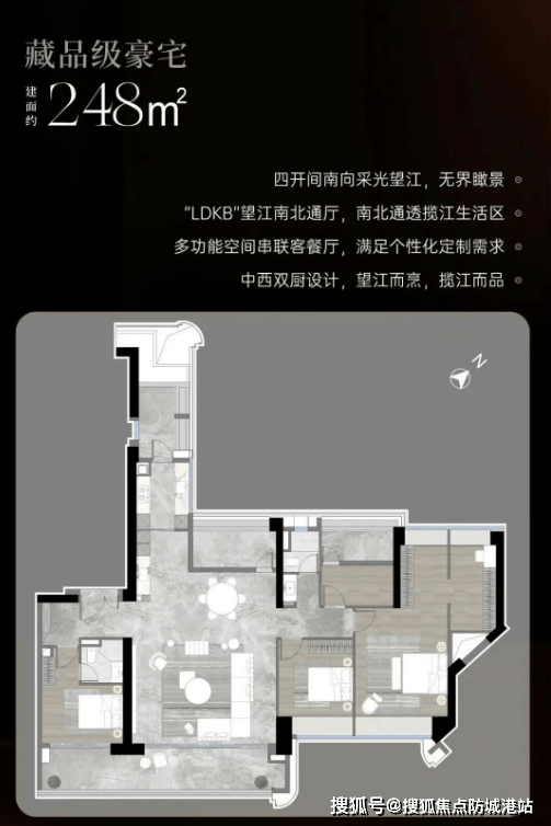 约248–253㎡四房:LDKB一体化巨厅,主卧套房带独立衣帽间与卫浴,双阳台设计,江景视野无遮挡;