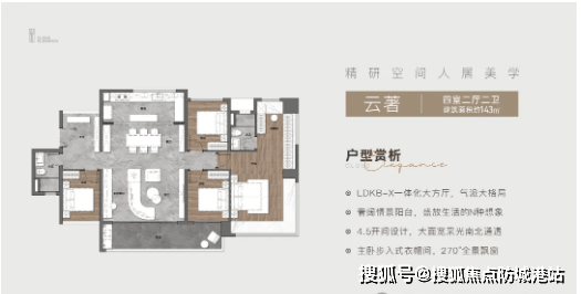 建面约143㎡四房两厅两卫:高端改善户型,极致空间享受,圈层专属优选。户型南北通透,横厅设计搭配全景阳台,尽揽社区园林景观;主卧套间尺度阔绰,配备独立卫浴、衣帽间与飘窗,打造奢华居住体验;其余卧室均配备飘窗,空间灵动多变;厨房采用U型设计,操作动线合理,适配大家庭日常烹饪需求,彰显品质生活格调。