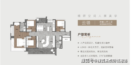 建面约121㎡四房两厅两卫:改善型户型,空间宽敞舒适,注重居住质感。采用横厅设计,客厅连接超大观景阳台,视野开阔,采光通风俱佳;主卧套间配备独立卫浴与步入式衣帽间,提升居住私密性与尊贵感;书房空间独立,可打造专属办公或阅读区域;卫生间干湿分离设计,保障日常使用便捷性,适配改善型家庭需求。